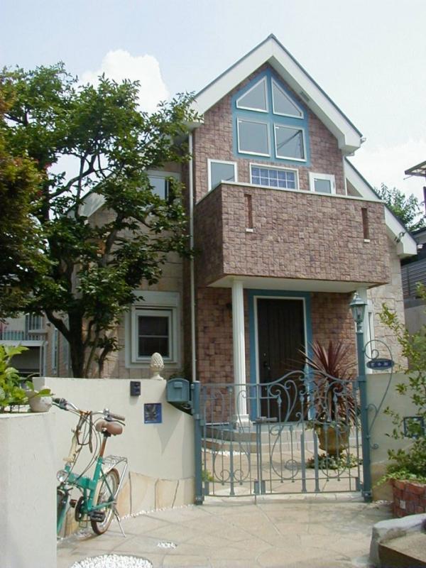 重厚な擬石張り、ブルーと白のモールが個性的な外観に合わせて門扉、ポスト、ポーチのタイルをブルー系で統一。