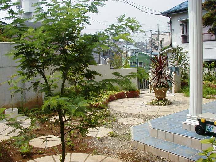 中心には、ポットに植えた観葉植物、バードバスも設置。