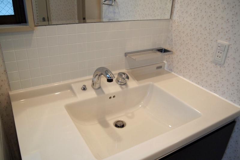 この鏡と、鏡下のタイル、水栓横の小物置き場、どれもお施主様がじっくりお選びになったものです。