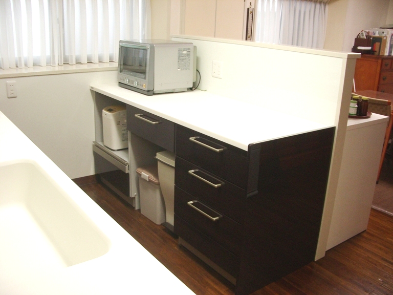 今回は、専用の家電置場を設置しました。こちらの色は、キッチンに合わせて濃い茶色です。