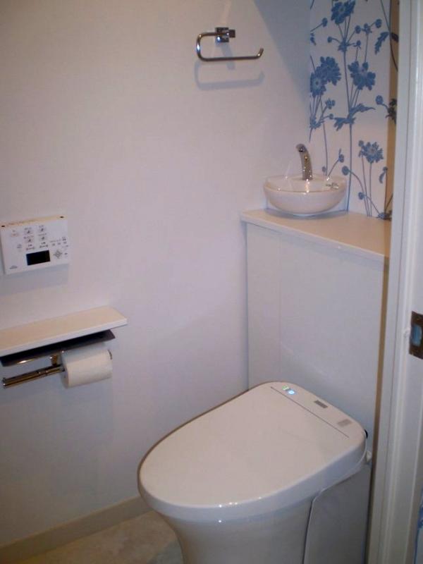 水色の大きな花のクロスを、洗面所に大胆に貼りました!