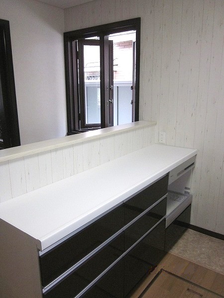 デッドスペースが多くコーナー部分が使いづらかったL字型のキッチンを、=(イコール)のように2列になった?型(にがた)のキッチンへ変更しました。