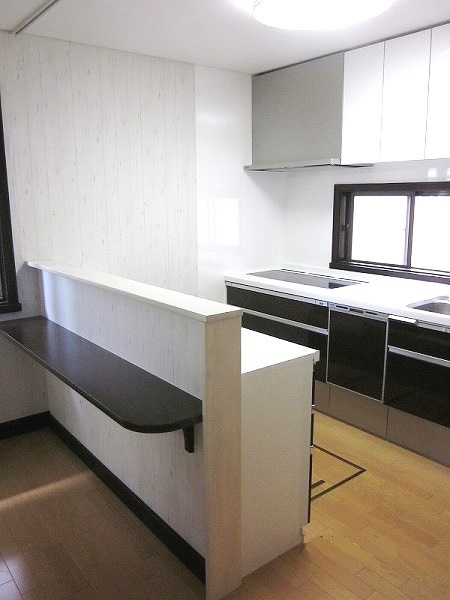 カフェ風にしたい、とのご要望で、収納スペースの裏側には腰壁を造作。そこにカウンターを取付けしました。イスを置いて、楽しめます。