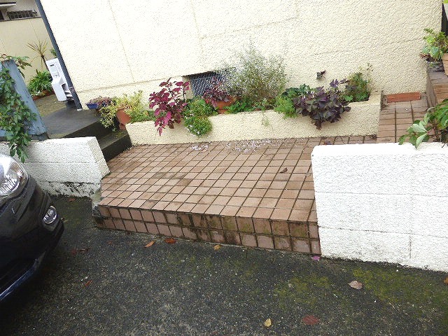また、駐車している車の関係で欠けてしまった玄関ポーチを補修。思い切ってR型に形を変え、周りをピンコロタイルで囲い直しました。とてもかわいい玄関廻りになりました。