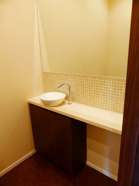 洗面カウンターの壁のモザイクタイルがとてもかわいらしくなっています。