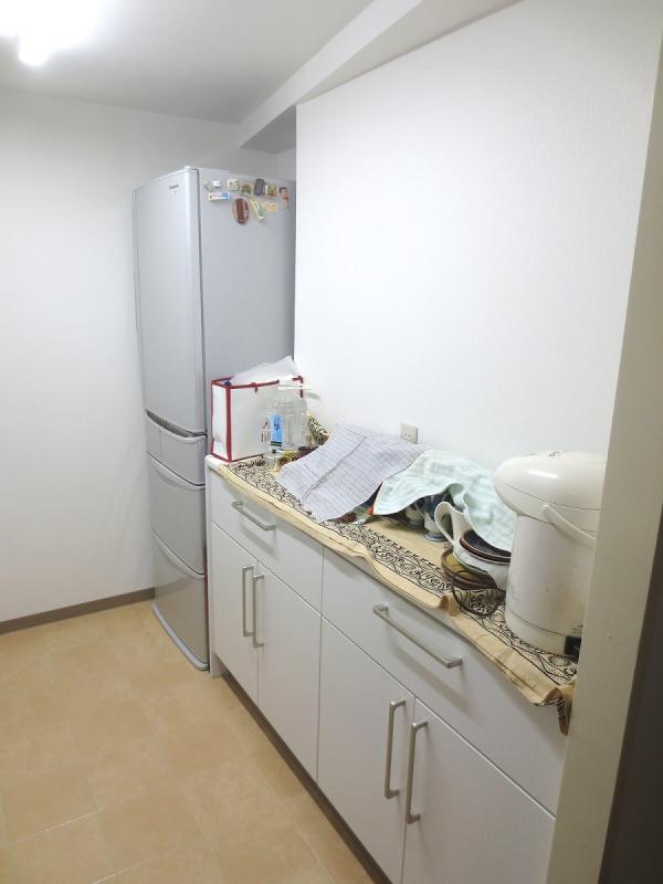 背面には、冷蔵庫と位置・奥行きを揃えて収納を設置。