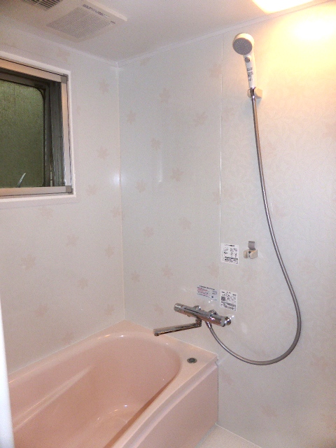 浴槽がピンク・壁と床が白のシンプルな色使いです。