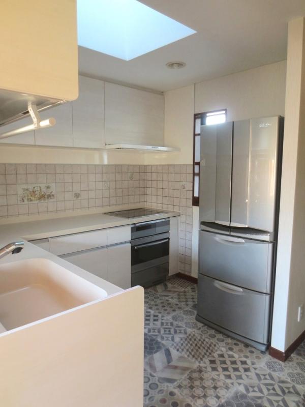 落ち着いたベージュでまとめましたが、同時に貼り替えた床にアンティーク調の柄を使い、明るく華やかな雰囲気を出してくれます。