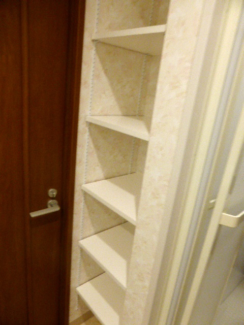 最後に、洗面台の背面、浴室への入り口脇に、収納棚を設置。