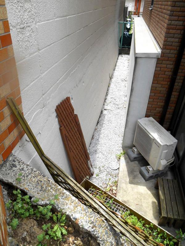 雑草対策として、建物まわりの土・砂利部分を埋めてコンクリートで固めました。 また、防犯対策として、道路との境にフェンスを取り付け、簡単に入り込めることのできないつくりになりました。