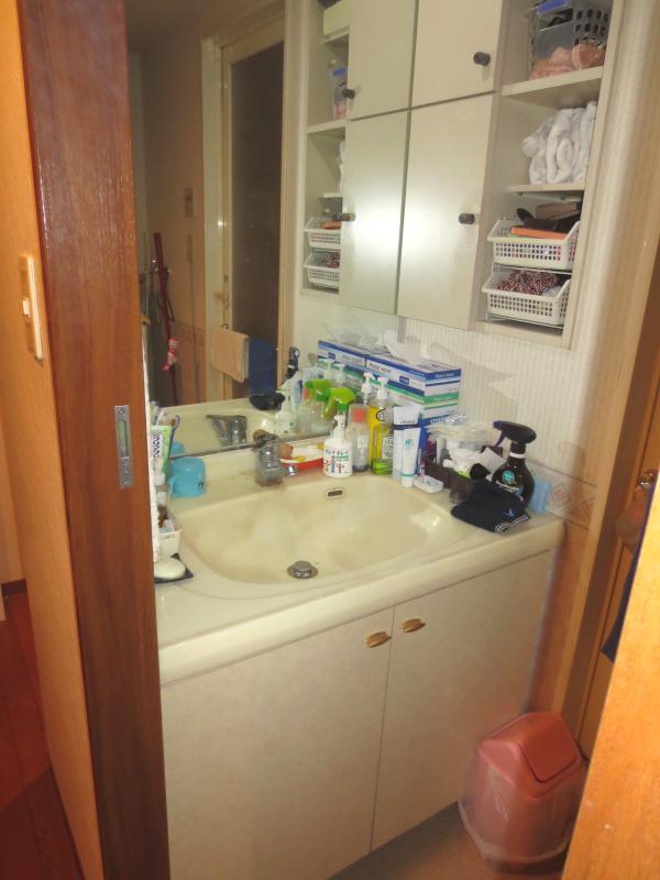 この三面鏡収納の設置に伴い、サイドの壁収納は撤去しました。