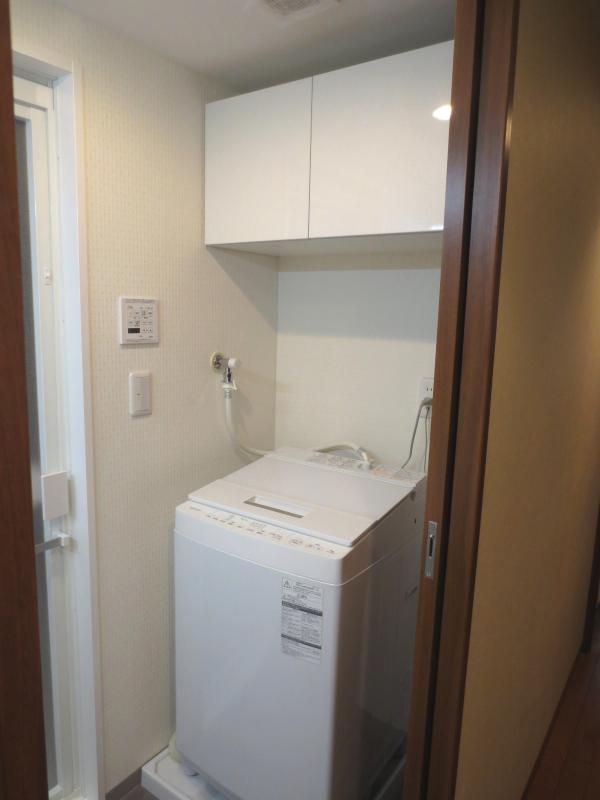 同じ洗面スペースにある洗濯機の上部に、新規で吊戸棚を設置しました。