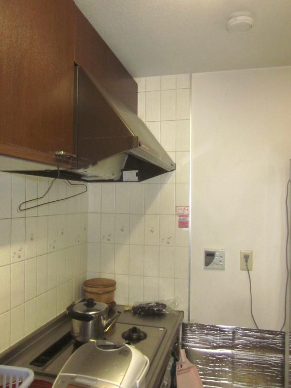 コンロのサイドの壁部分は、油はねや汚れの予防として、このパネルを、既存のタイル貼りの時より大きな幅で貼っています。
