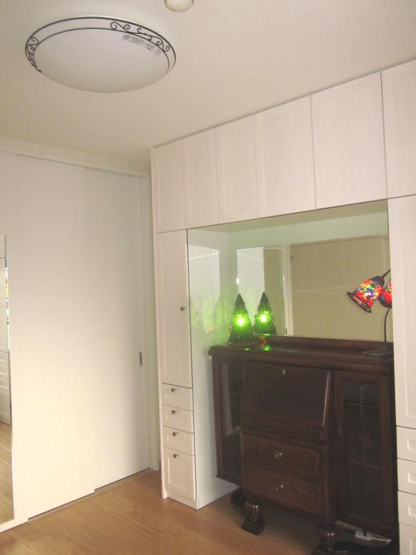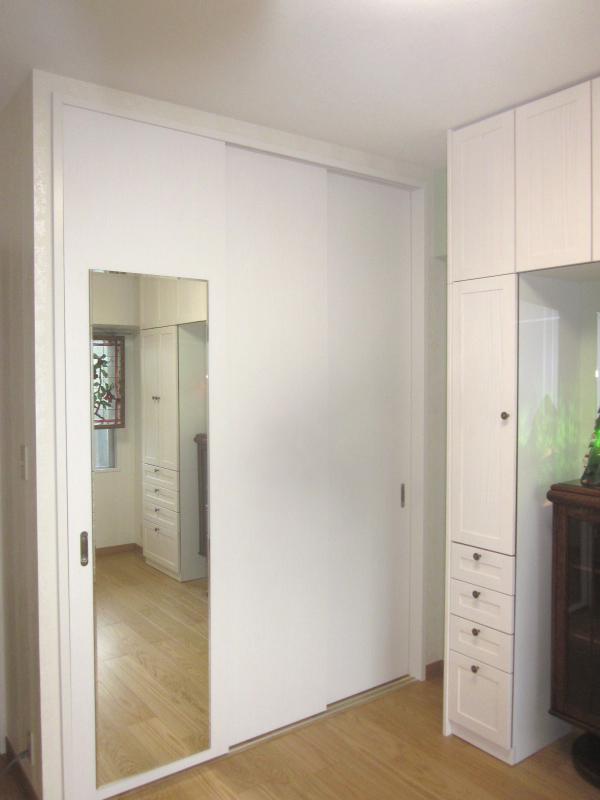 隣にある作り付けのクローゼットは、扉を、2枚引き戸から、天井までつながった3連引き戸へとお取替え。