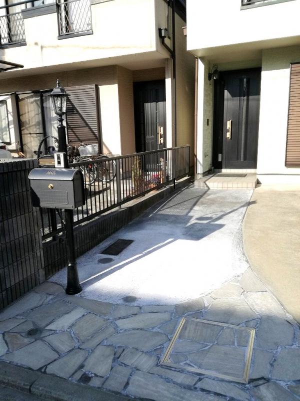 入り口から玄関ポーチまでのアプローチに自然石を敷き、道路近くに、自立型のポスト・表札・照明を設置。ヨーロッパ風のおしゃれな玄関へとかわりました。