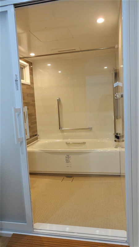 浴室浴槽はミナモ浴槽。上側の縁をできる限り広げ、ゆったりとした開放感を味わえます。また、シャワーバスを取り付け。両脇の2本のバーには、5か所ずつシャワーの出る場所があり、動きづらい車いすの状態でも体中あたたまることができます。