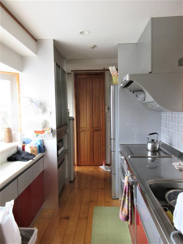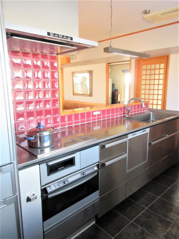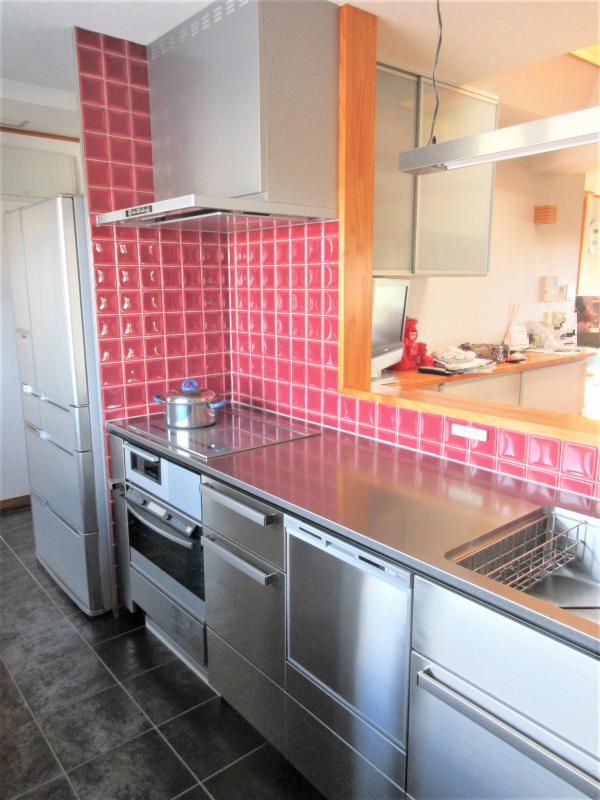 オールステンレスのキッチン・鉄さびのような雰囲気を持った床のタイル、とシックにまとめた中で、キッチン前面・側面の赤いタイルがアクセントになっています。
