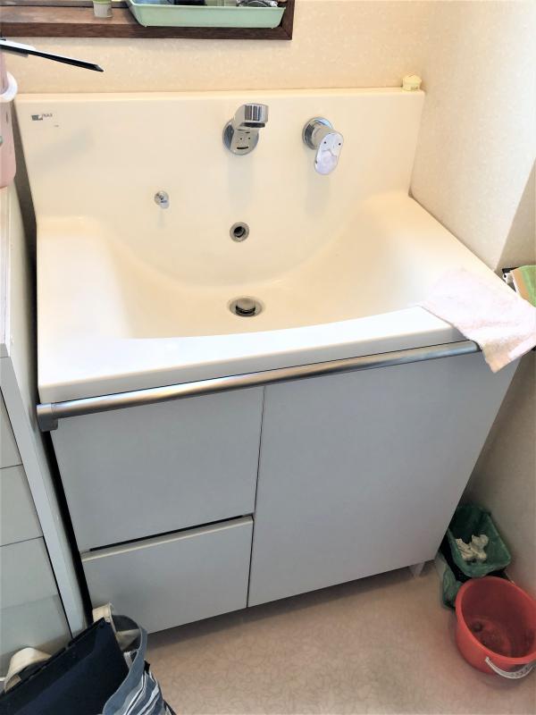 既存と同じタイプの洗面化粧台いへの取替工事です。使い勝手が変わらないので、安心して使っていただけます。