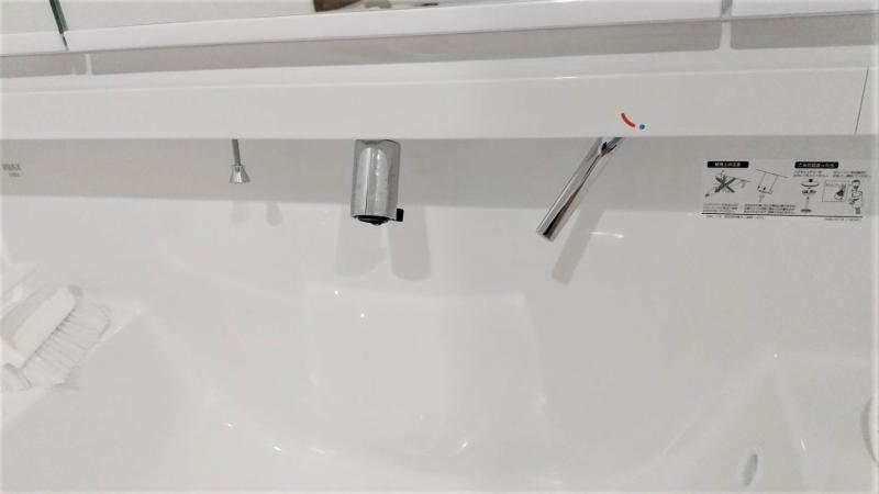 ミラー下から洗面ボウルまで一体型なので溝がなく、これもお掃除しやすい理由の一つです。