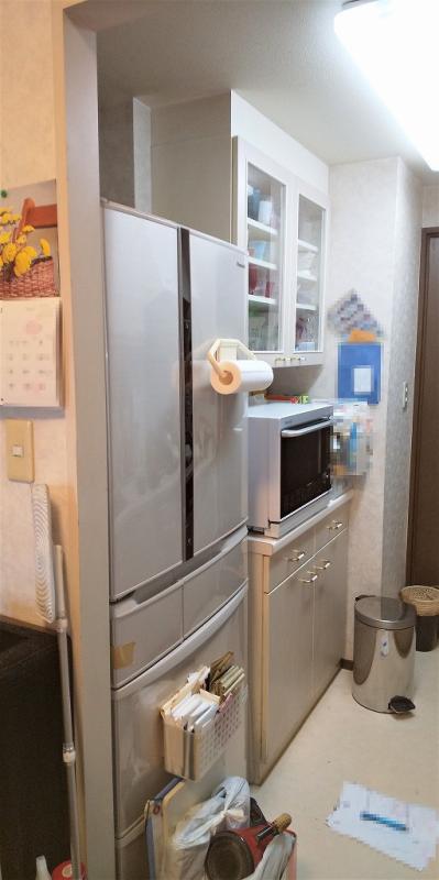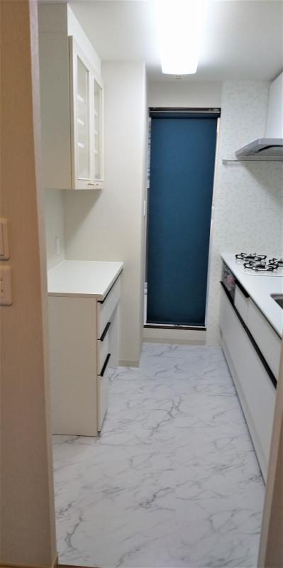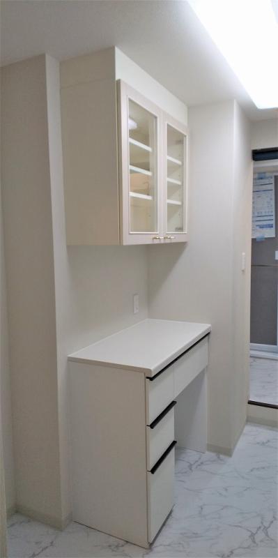 背面には、キッチンと同シリーズのキャビネットを取り付け。(上部吊戸棚は既存)