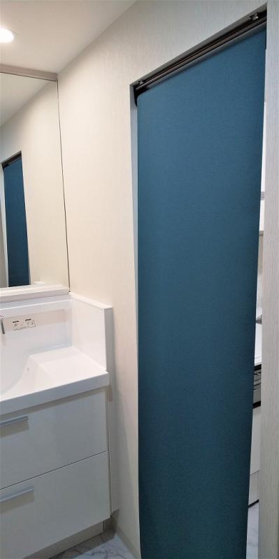 隣のキッチンとの境にあった扉はロールスクリーンへ変更。ブルーがアクセントになり、空間を引き締めてくれます。