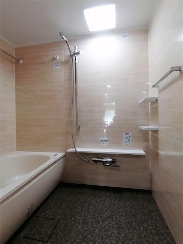 キッチンとUBは、優しい色合いのアースカラーでまとめて落ち着いた空間へ。