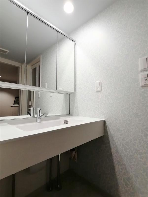 トイレの「いちご泥棒」・洗面の「シスル(あざみ)」、どちらも有名なデザインですが、色を抑えめなブルーグレーにしたことで華やかですが品のある空間になりました。