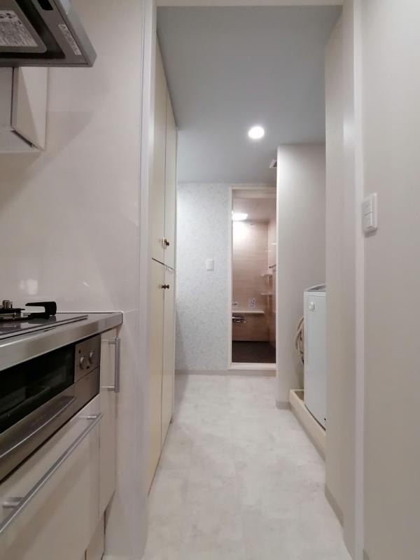 かわいいピンクのキッチンから、光沢のある薄いベージュのキッチンへのお取替え。