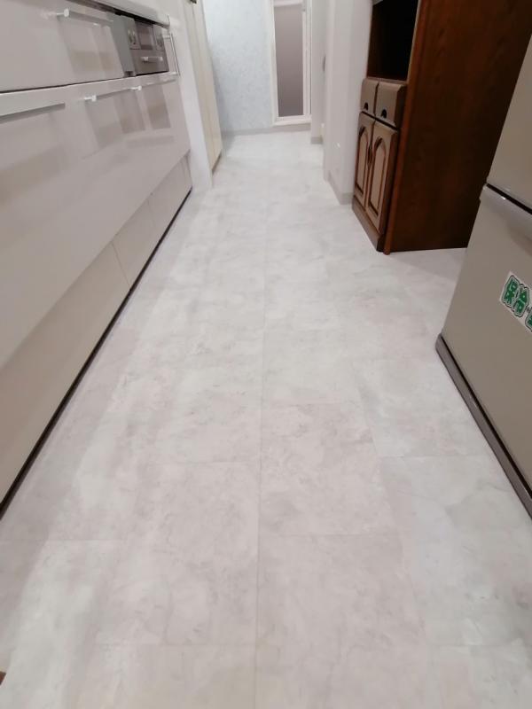 床の大理石調のCFと合わせてアースカラーで、上品で大人な雰囲気のキッチンスペースに変わりました。