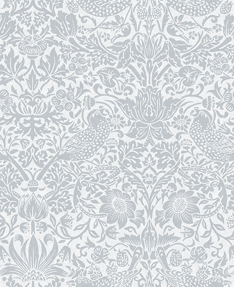 ドアを開けた正面の壁に、ウイリアム・モリスの「いちご泥棒」がデザインされたブルーグレーのクロスを貼り、華やかさと個性を出しました。
