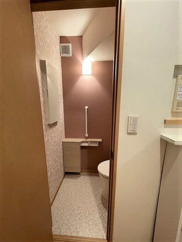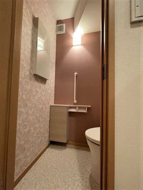 その隣の壁に濃い目のピンクのクロスを貼ることで、空間を引き締めています。