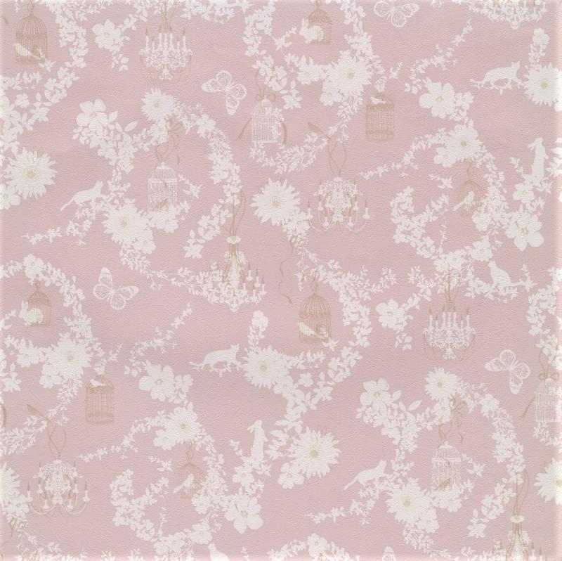 正面の壁には、花・鳥・猫などが描かれたクロス。レースの模様にも見えるカジュアルエレガンスなクロスです。