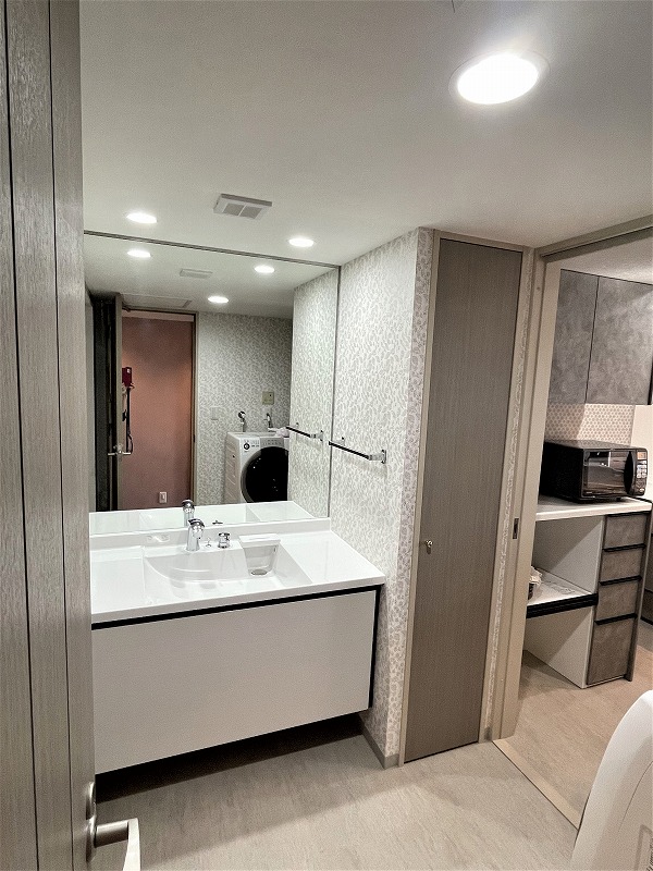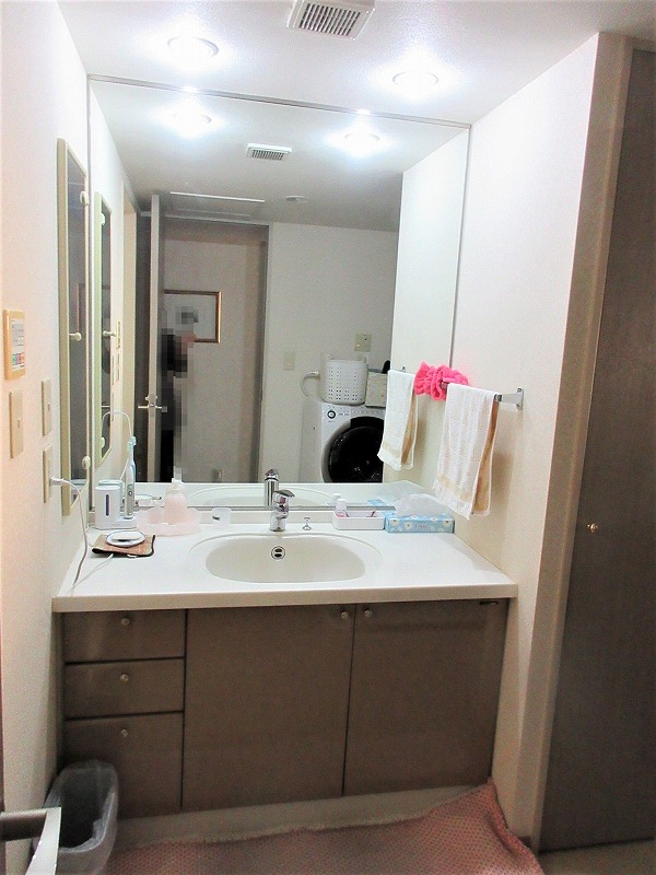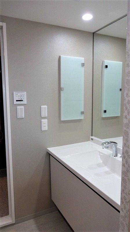 壁一面の大きなミラーは残し、下台のみ交換しました。