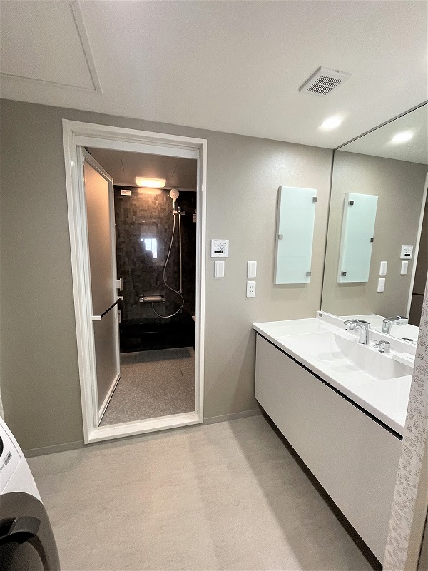 壁のクロスは貼り替えました。洗面スペース左側に、エンボス加工がされているようなグレーのレザー調クロス。その他の壁は、銀の点で描写された植物柄のクロス。落ち着いた大人な雰囲気の空間です。