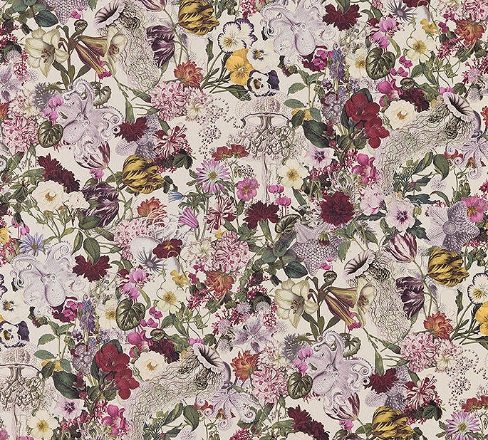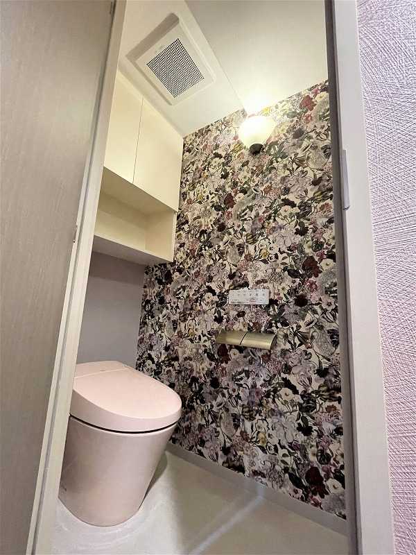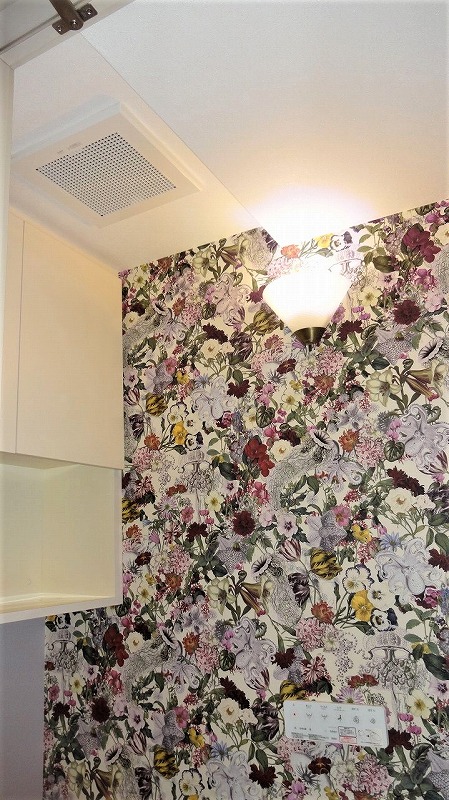 ゴージャスな花柄クロスに見えますが、よく見ると海洋生物が隠れているアーティスティックなクロスです。他面をラベンダー色のクロスでまとめることで、豪華すぎず高級感のある仕上がりになっています。