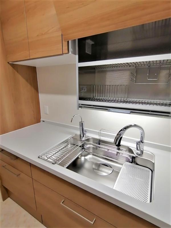 シンク上の棚は、グレードが上のダウンウォールになっており、水切りかごの代わりに使えます。