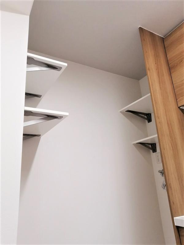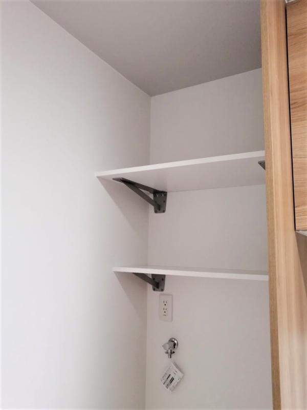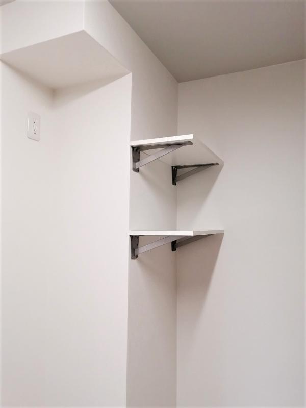 その壁の奥は移動した洗濯機置き場です。上部に、いろいろと使える棚を取り付けました。