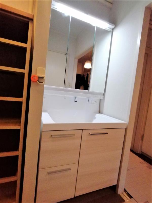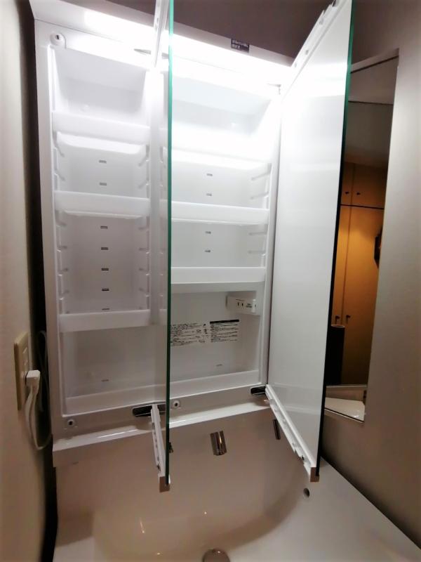 照明は、三面鏡の上部に幅いっぱいに伸びたライン照明。広範囲を均等に照らしてくれるので、手元も明るくなります。