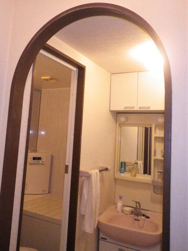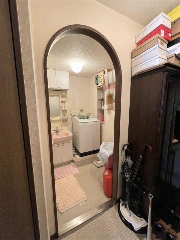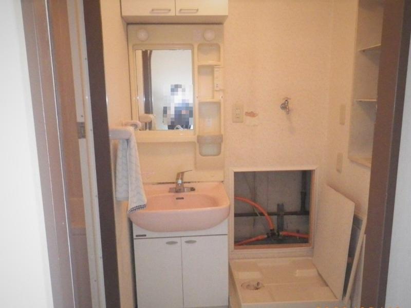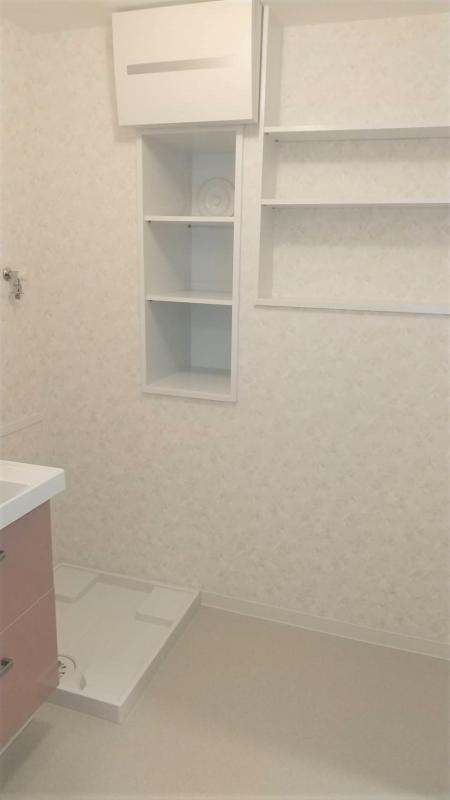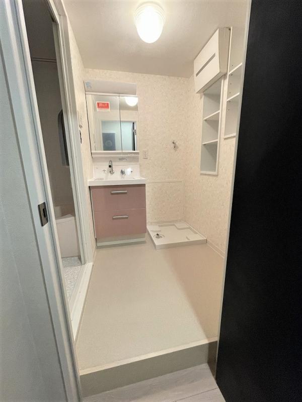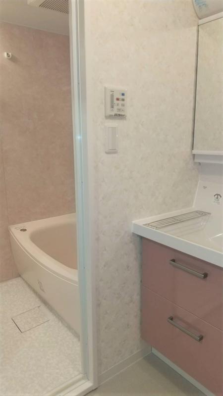洗面室全体に、扉色に合わせて淡いピンクの花柄クロスを貼り、落ち着いた雰囲気を出しました。右端の壁収納は白く塗り替えて雰囲気を合わせました。