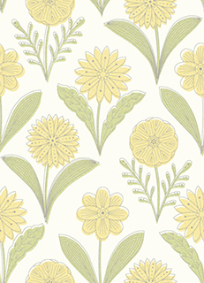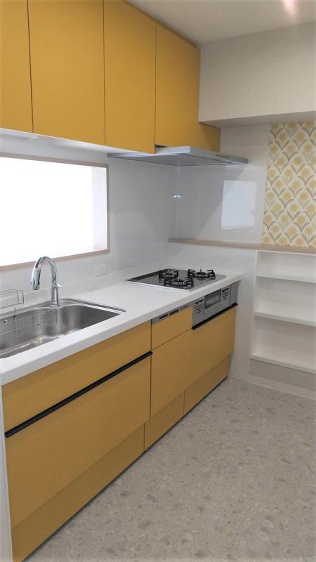 キッチン奥の壁には、配管スペースを利用して収納棚を造作。カジュアルなイエローの花柄クロスを貼り、かわいらしさを演出。空いている空間の有効利用になっています。