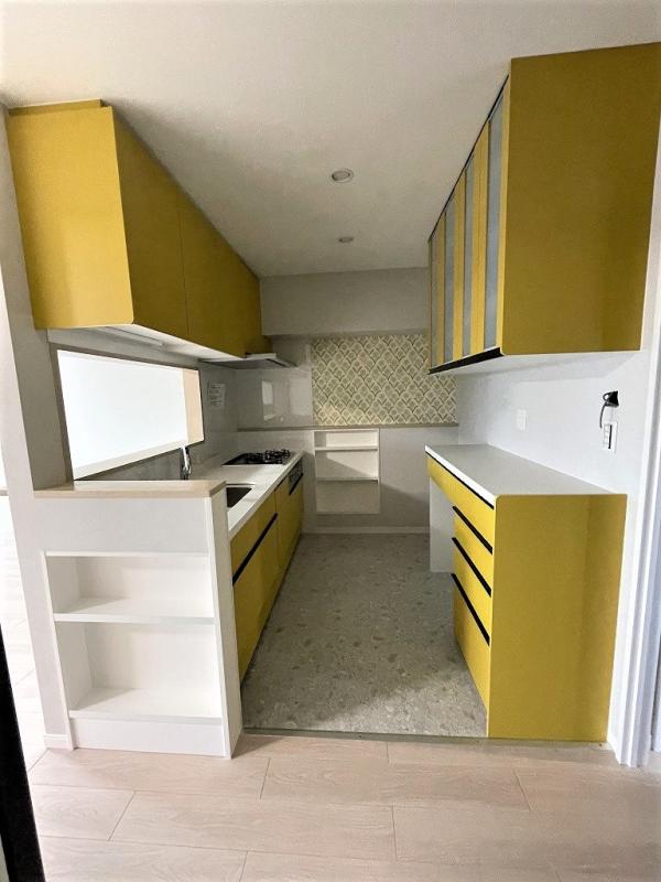 扉色はマスタードイエローで統一。ぱっと目を引く色で、気分も明るくなります。取っ手部分をブラックにしているのがアクセントになっており、イエローを引き締めています。