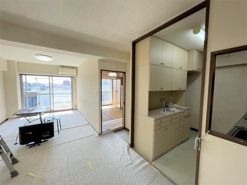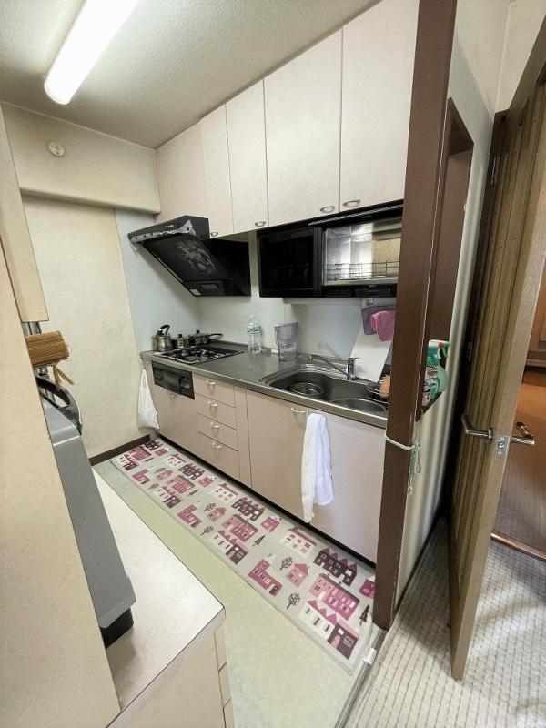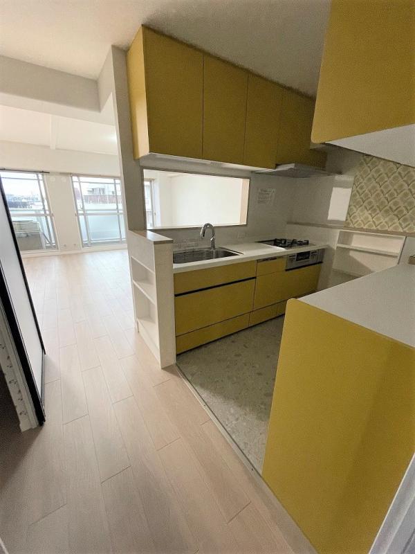 システムキッチンと収納の位置を入れ替え、対面型キッチンへと変更。