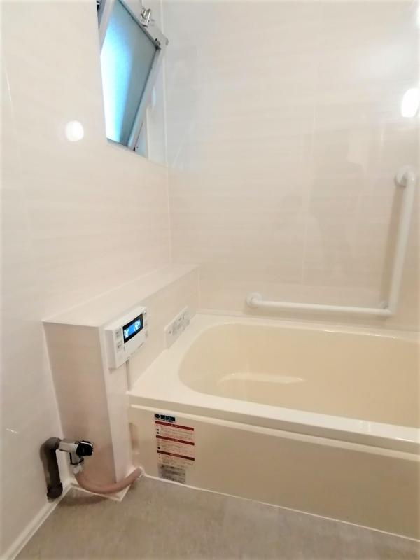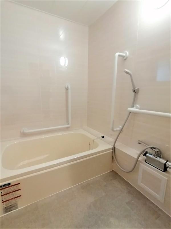 浴槽はユニバーサルデザインタイプの浴槽。またぎが低い・内部に肘掛けがついている・浴槽底面に凸凹模様の加工がされている(滑り止め)、といったお子様にもお年寄りにも安心できるものです。