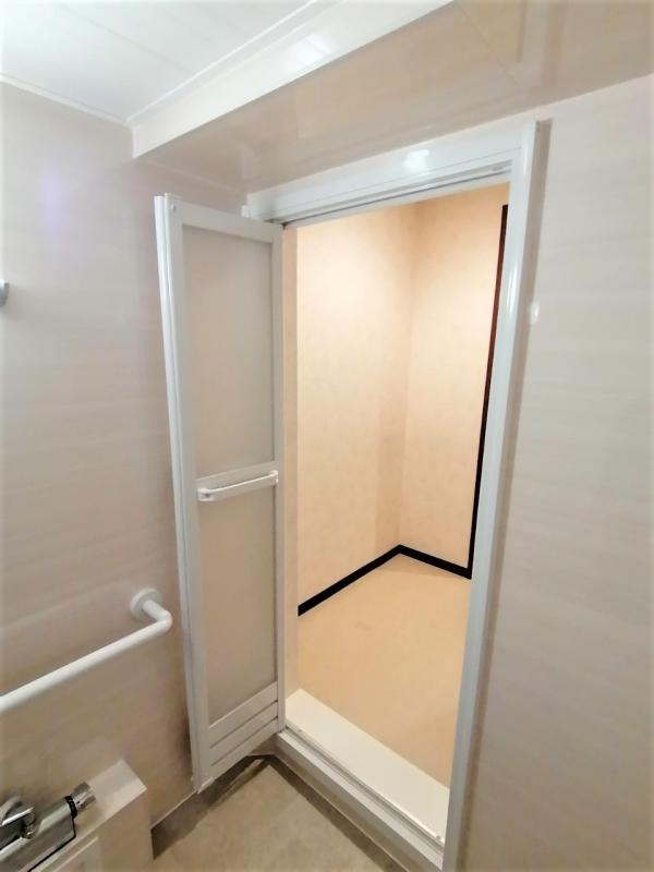 床には浴室用床シートを貼りました。クッション性があり滑りにくく、ヒートショックの軽減にもなる床材です。