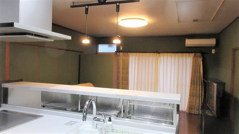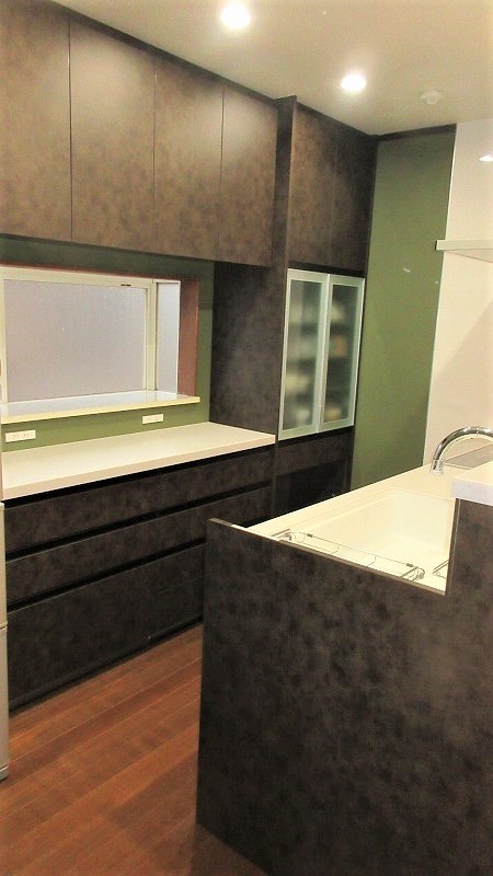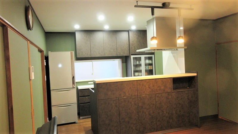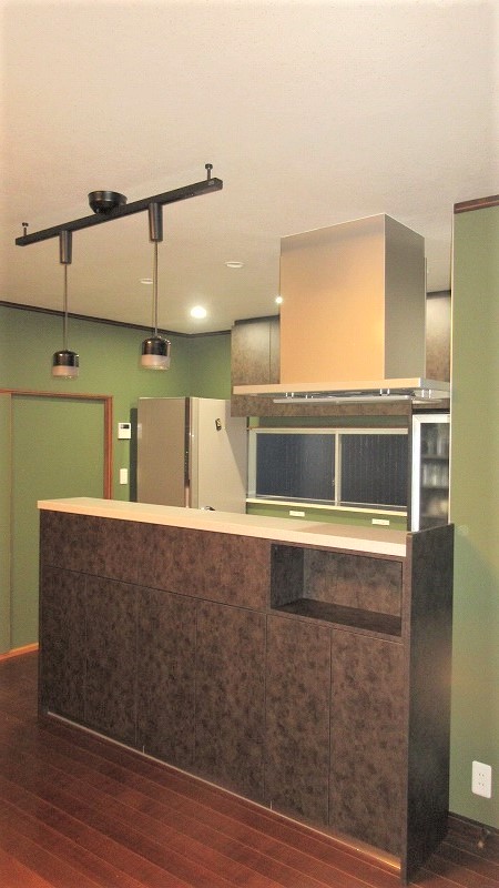 LDK全体の壁にモスグリーンのクロスを貼り、照明はダクトレールのペンダント照明を取り付け、落ち着いた、シックな雰囲気のキッチンへと変わりました。