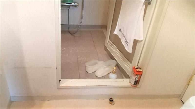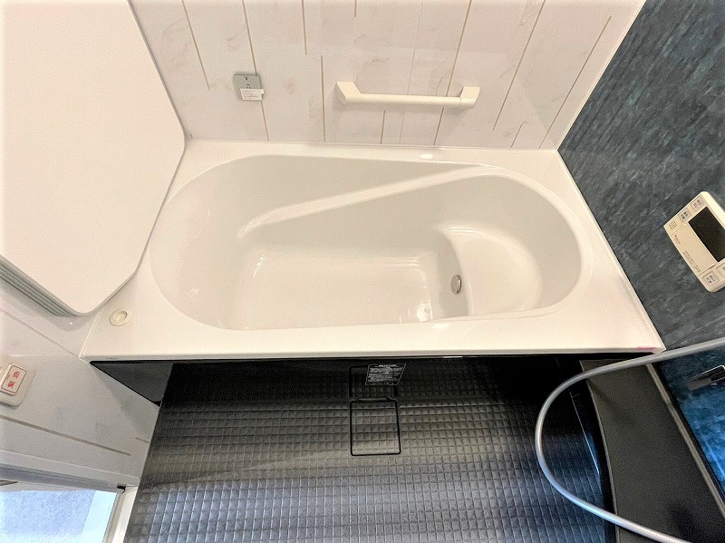浴槽はベンチ浴槽。浴槽内に段差が付いており、座って半身浴も楽しめます。また、この段差の分、節水にもなります。