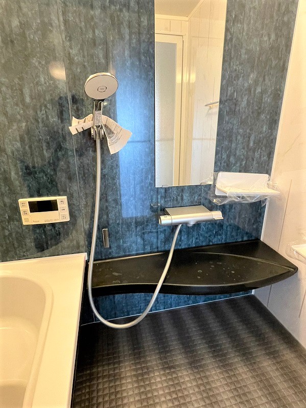 大理石調ホワイトにゴールドのラインが入った壁パネルをメインに、ブルー掛かった大理石調のパネルをアクセントとして使い、高級感のある浴室になりました。