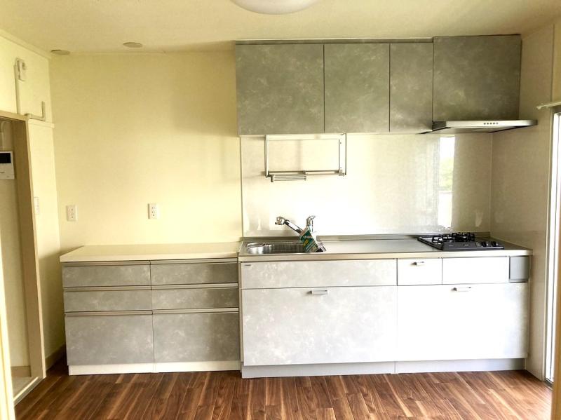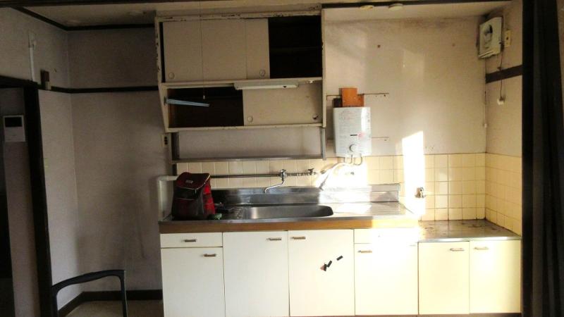 むき出しの給水管は隠し、コンロは一体型へ、壁付けの小さなプロペラファンはフード付きシロッコファン(レンジフード)へ。