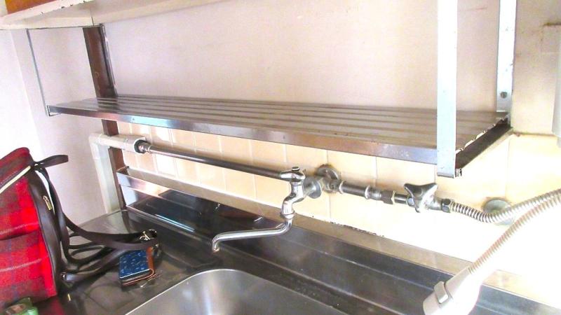 シンク上部のステンレスパイプ棚は、洗い物の水切りに仕えて便利です。