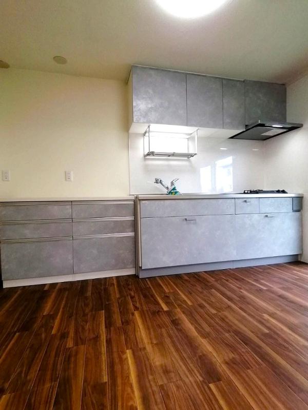 扉色は大理石調のグレーを選択。張り替えた濃い木目調CFと合わさり、上品な大人の印象を受けます。